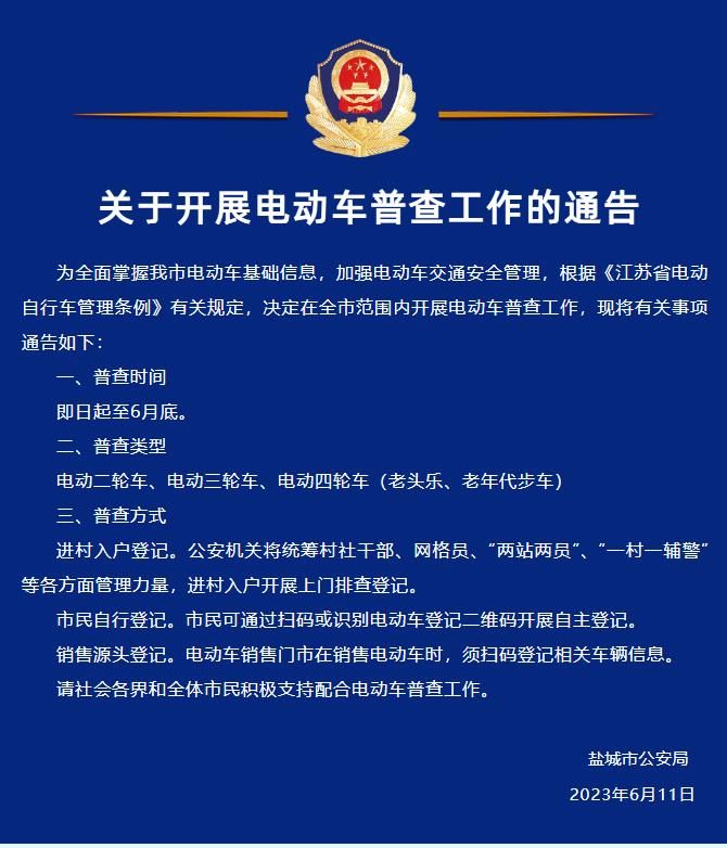 根据盐城市公安局《关于开展电动车普查工作的通告》精神,请全校师生员工自觉积极配合,按照登记操作步骤在6月底前完成电动车普查登记工作。具体填报事项也可详见:https://mp.weixin.qq.com/s/vqKybHYfSn3jJXu6X_-lgQ。