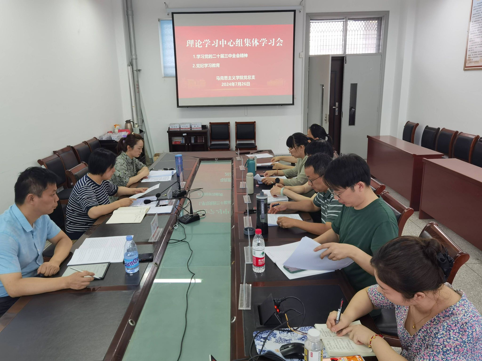 7月26日下午,在博学楼A514会议室,公司党总支理论学习中心组围绕“党纪学习教育”和“党的二十届三中全会”两个专题举行学习研讨会。公司党总支书记、常务副经理胡凌霞主持会议,理论学习中心组全体成员参加。