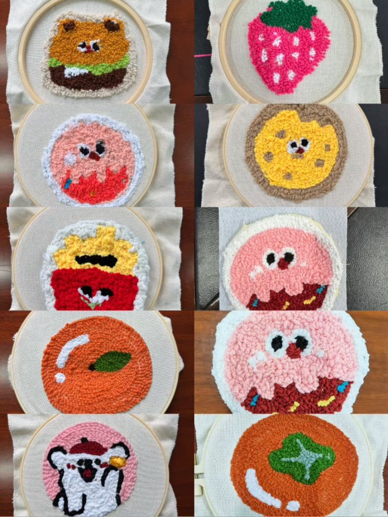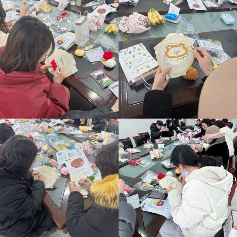 现场气氛热烈,大家欢聚一堂,公司分工会主席葛平向女教工致以节日祝福,并简要介绍活动安排。随后工作人员播放操作视频,讲解戳戳绣基础知识,包括工具使用、针法技巧等制作过程。女教工们陆续开始动手创作个人作品,大家认真‘绣’画,互帮互助,分享创作感受,欣赏创作成果。