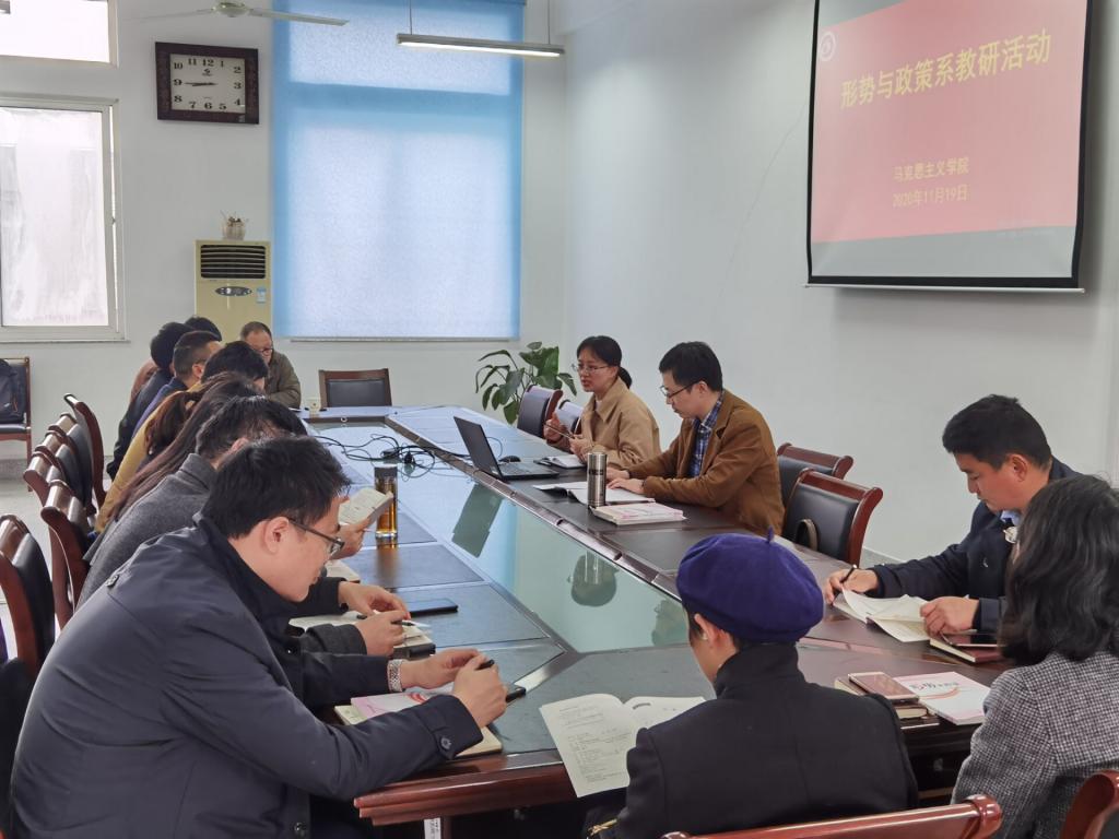 2020年11月19日上午,形势与政策教研室在南校区博学楼A514室举办教研活动。教研室专兼职教师十余人参加了本次活动。活动由教研室主任董海龙副教授主持。