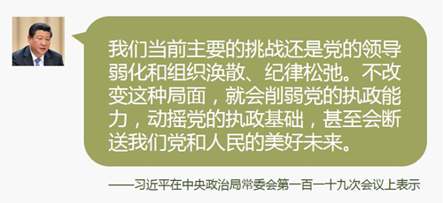 ·我们这么大一个政党,靠什么来管好自己的队伍?靠什么来战胜风险挑战?除了正确理论和路线方针政策外,必须靠严明规范和纪律。我们提出那么多要求,要多管齐下、标本兼治来落实,光靠觉悟不够,必须有刚性约束、强制推动,这就是纪律。